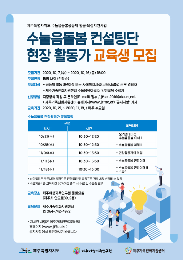 제주가족친화지원센터에서는 수눌음돌봄 공동체의 형성과 성장을 현장에서 지원할 현장 활동가 교육 참여자를 다음과 같이 모집하오니, 관심 있는 여러분의 많은 참여 바랍니다.